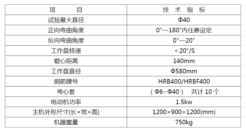 該試驗機是對鋼筋進行冷彎試驗和平面反向彎曲試驗的一種工藝設備。其主要參數符合GB/T1499.2-2007《鋼筋混凝土用圓鋼第2部分:熱軋帶肋鋼筋》和YB/T5126-2003《鋼筋混凝土用鋼筋彎曲和反向彎曲實驗方法》中的有關規定。