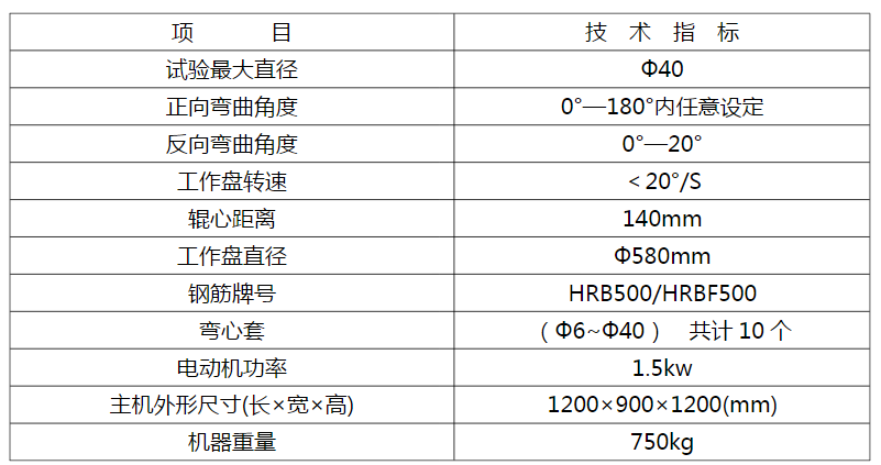 該試驗機是對鋼筋進行冷彎試驗和平面反向彎曲試驗的一種工藝設備。其主要參數符合GB/T1499.2-2007《鋼筋混凝土用圓鋼第2部分:熱軋帶肋鋼筋》和YB/T5126-2003《鋼筋混凝土用鋼筋彎曲和反向彎曲實驗方法》中的有關規定。