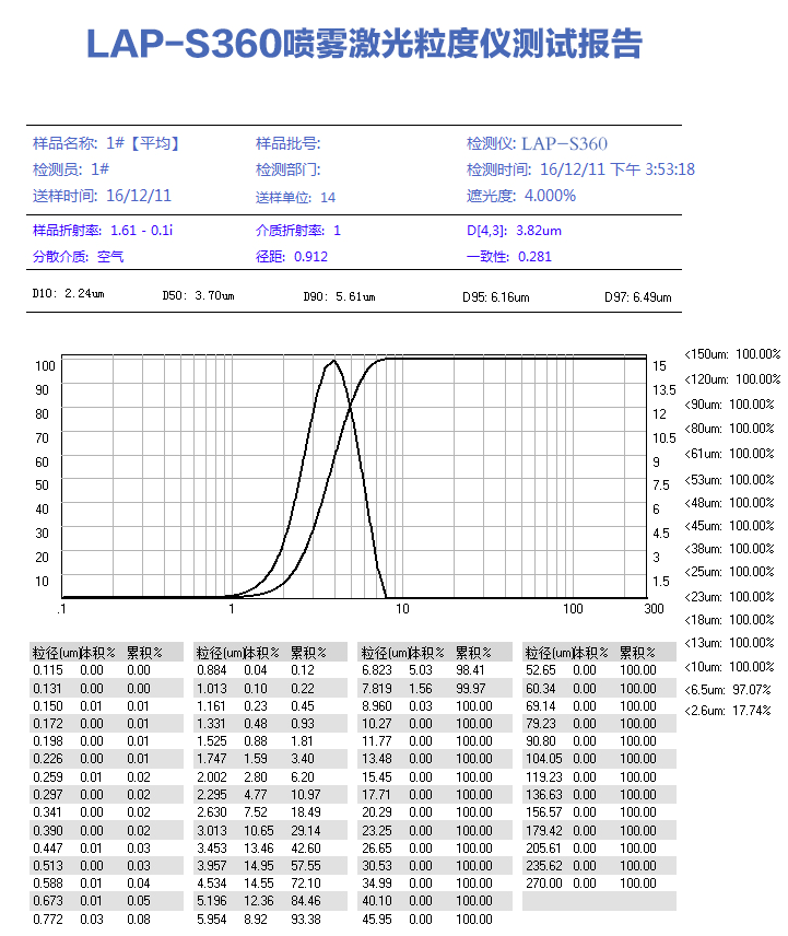 超寬量程:LAP-S360的設計量程達到了0.1μm~270μm,能夠滿足噴霧設備領域內絕大多數用戶的粒度測試需求。
